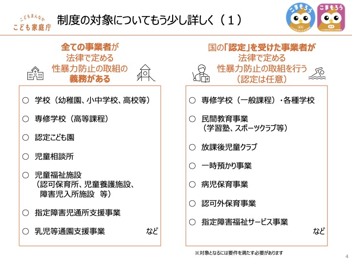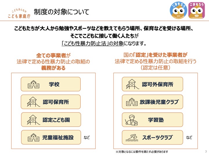 日本版DBS(こども性暴力防止法)申請サポート 日本版DBS(こども性暴力防止法)が施行 いよいよ日本版DBS(こども性暴力防止法)が2026年12月25日から施行されます。「義務事業者ではないけど導入した方が良いのかな?」「まだ先だし制度も難しそうでよくわからない⋯」 と対応を先送りにしていませんか?義務事業者でないからこそ他社との差別化が今後の運営成功のカギとなります。施行直前には多くの任意事業者が駆け込み申請し、認可確認が必ず混み合います。認定には申請から許可まで時間がかかるため、他社が様子見していて行動していない今こそ、申請のチャンスです。 お問い合わせはコチラ そもそも日本版DBSとは? 「日本版DBS(こども性暴力防止法)」は、子どもと接する仕事に就く人の性犯罪歴を国が確認する制度です。イギリスのDBS(Disclosure and Barring Service)をモデルにしており、2024年6月に成立、2026年12月25日に施行される予定です。日本版DBSを導入することが、今後保護者が安心して預け先を選べる指標として選別されるようになります。 制度の対象 制度の対象は「義務事業者」と「認定事業者」に区分されます。これから保護者の方々が注視するのは、普段の生活で子供達を預ける先になる塾やスポーツクラブなどが「認定事業者」として安心して子供を預けられる場所に認定されているかどうかとなってきます。 義務・認定された事業者は「日本版DBS認定事業者」となり、こども家庭庁に対して、職員の性犯罪歴の有無を照会することになります。施行時にすでに働いている職員も確認の対象となります(猶予期間あり)。 認定事業者の「証」 認定を受けた事業者は、国から交付される**認定マーク「こまもろう」**を使用できるようになります。今後、これらのマークが社会に浸透することにより、性暴力から「こどもをまもろう、みんなでまもろう」という意識が社会全体に広がることを目指します。 左:認定事業者マーク(学習塾やスポーツクラブなどで、国の認定を受けた事業者が表示可能)右:法定事業者マーク(学校、認可保育所などの義務対象事業者が表示可能) 認定のメリットとデメリット メリット 信頼の可視化 ウェブサイト、チラシ、名刺、看板などに認定マークを掲載できる。 国の公表 こども家庭庁のホームページに「認定事業者」として名前が掲載される。 人材確保 「性加害を許さない体制」をアピールでき、質の高い人材を採用しやすくなる。 デメリット 運用ルールが不確定 具体的な運用ルール(ガイドライン)が、まだ最終確定前であり、有識者会議で議論が続いています。 運用コスト 5年ごとの再確認コスト・運用の負担が中小規模事業者には重くなる可能性あり。個人情報(前科情報など)のセンシティブ性が高いため、漏洩リスクやプライバシー保護の厳格な運用が不可欠。 運用に関するコストや負担はかかってしまいますが、それでも子供を預かる業者にとっては今後必要不可欠の認定証になってきます。保護者の立場になれば、認定事業者と非認定事業者、どちらに大切な我が子を預けたいかと考えれば明白でしょう。 申請手続き 認定のための申請手続きは正直なところとても面倒です。日々の業務に追われながらの手続き準備はつい後回しになってしまいますよね。そんな時は、認可手続きのプロにお任せください。申請準備のご案内から認可取得まで、しっかりサポートさせていただきます。認定手続きに加え、実際の現場を動かす為の就業規則や各種規程の改訂、情報管理体制の構築のご相談も承ります。見積もりや相談は無料です。まずはお気軽にご連絡ください。 サービス費 申請手続き代行 1件:5万円〜 ※事業者規模により異なります 子どもたちの安全が法的に早く守られるよう、関係事業者さまの努力もとても大切になりますので、認可のプロの私たちと一緒にがんばりましょう!申請から運用まで幅広くサポートいたします。まずはお気軽にご相談ください。 ご相談・お問い合わせ 電話・FAX、または下記お問い合わせフォームよりお気軽にご連絡ください! TEL:050-6863-6317FAX:050-6868-9365携帯:080-1218-9831 お問い合わせフォーム お名前 (必須) メールアドレス (必須) 内容 お問い合わせご依頼その他 題名 メッセージ本文 プライバシーポリシーをご確認の上、同意するにチェックしてご送信ください 同意する Δ